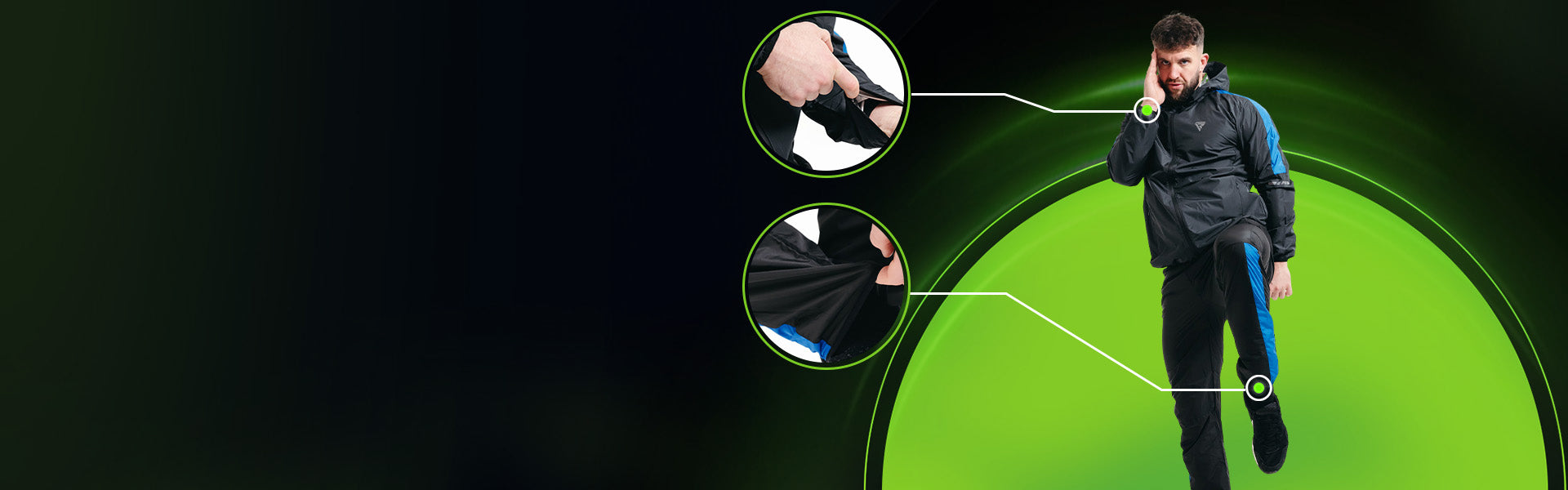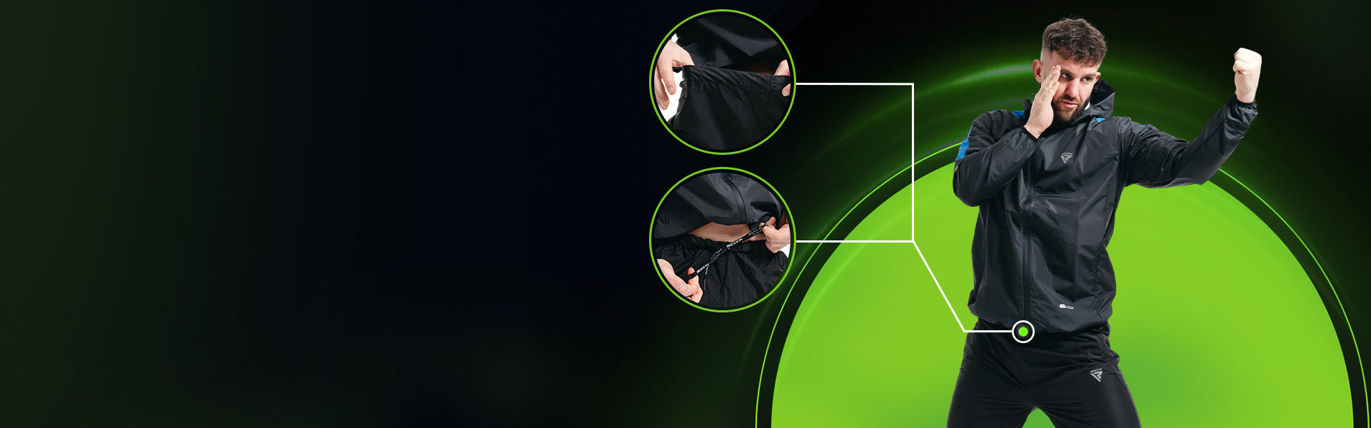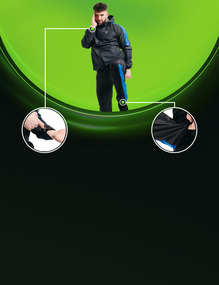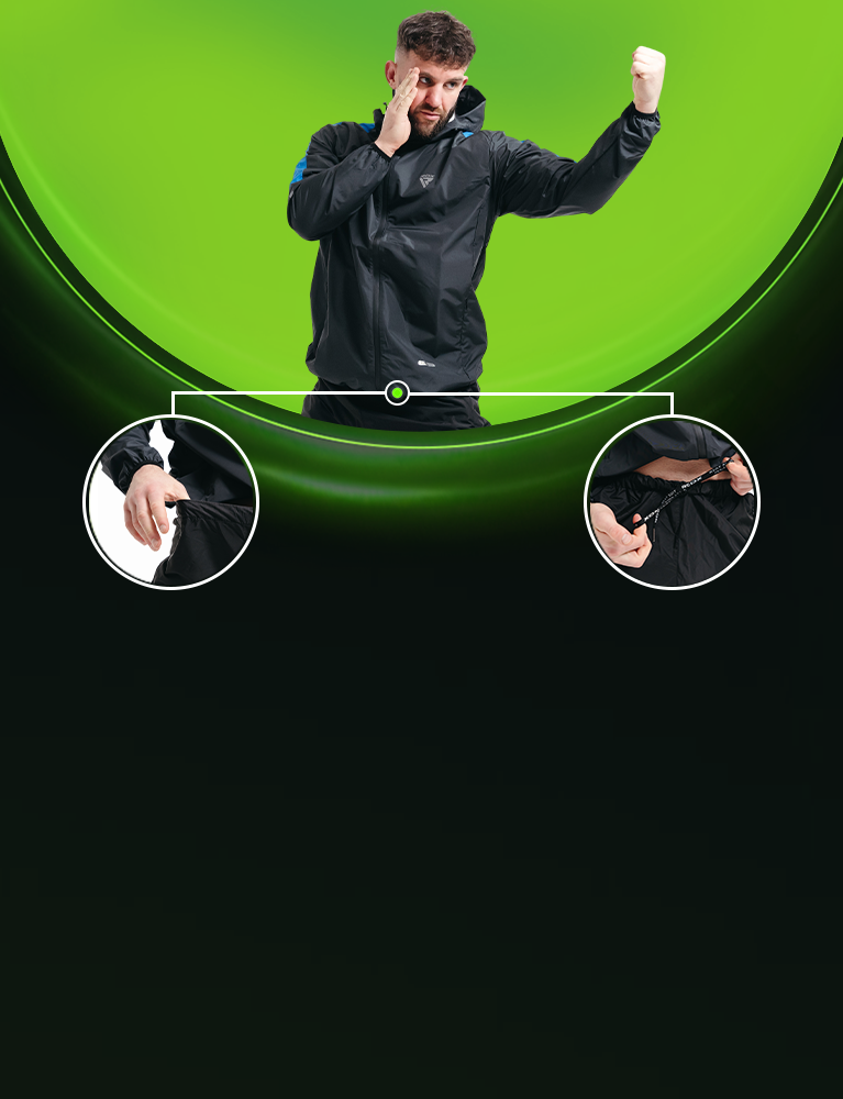 - Elasticated cuffs and ankles retain heat for boosted perspiration.