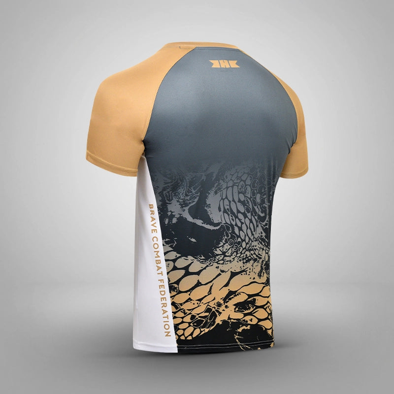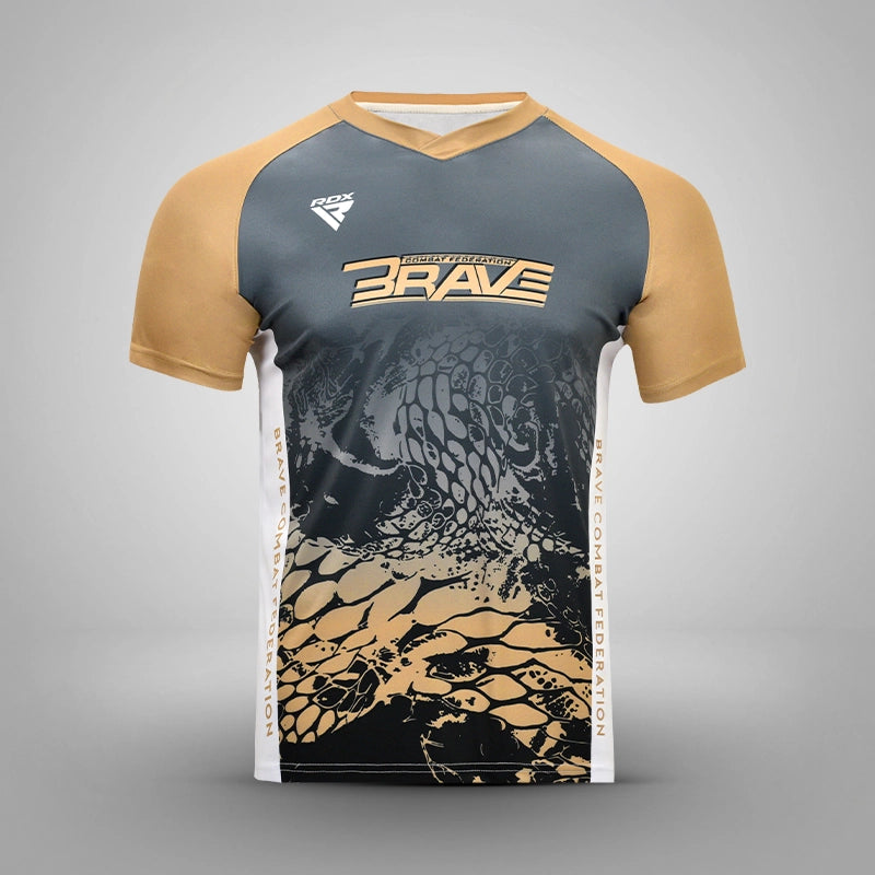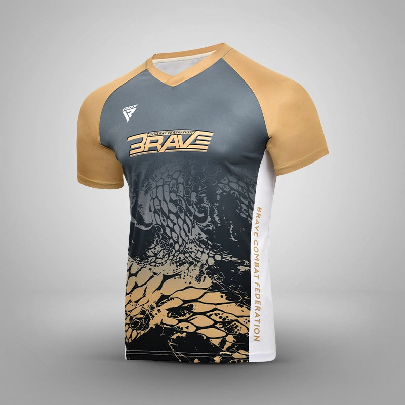 The V-neck, short-sleeve tee is performance-ready. Embody the persona of your favorite fighter, feel the heat of walking down the aisle! With moisture-wicking technology to keep the wearer dry throughout their high-intensity workout, these shirts are best for both the gym and just repping our Brave Merch.